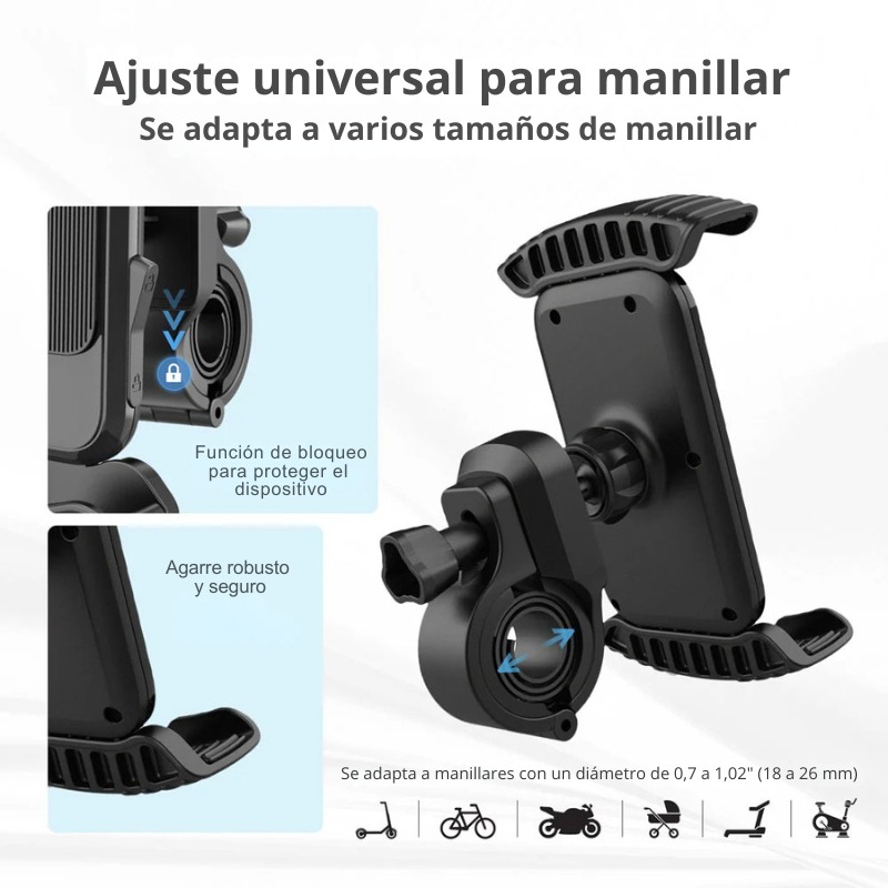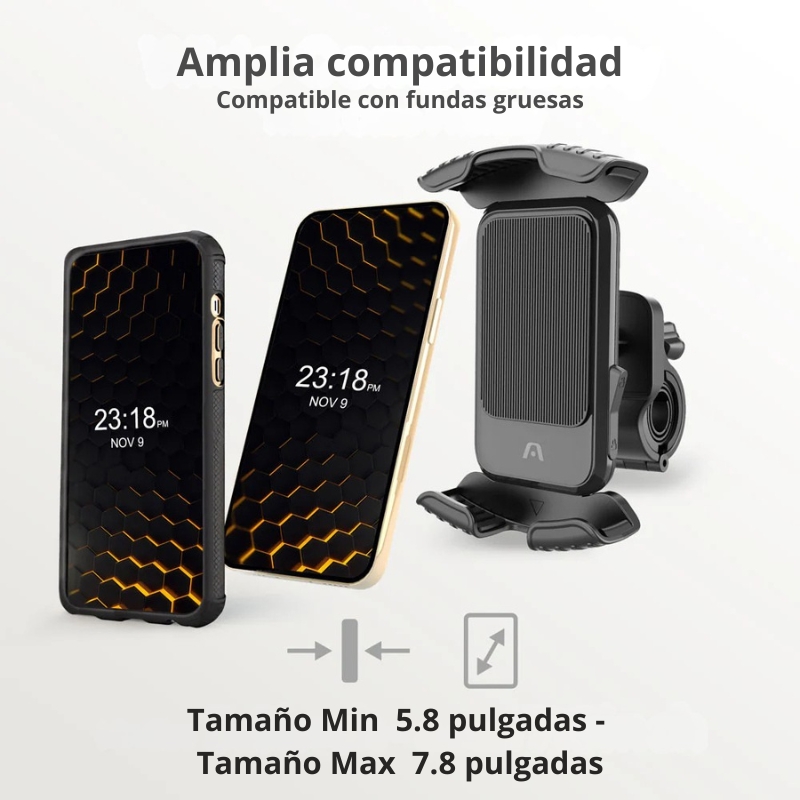Compatible con una amplia gama de teléfonos inteligentes (desde 5.8 hasta 7.8 pulgadas), incluso con fundas gruesas. Su sistema de montaje ajustable se adapta fácilmente a manubrios de entre 18 mm y 26 mm de diámetro. Ideal tanto para bicicletas como motocicletas.