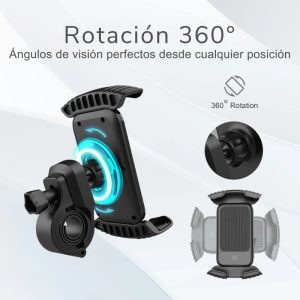 Soporte universal para celular con rotación 360°, compatible con bicicletas y motocicletas. Ideal para teléfonos de 5.8” a 7.8” con montaje seguro, resistente y de fácil instalación.